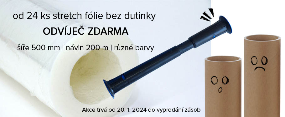 Zakupte alespoň 24 ks ruční stretch fólie bez dutinky šíře 500 mm s návinem 200 m a získejte Odvíječ pro stretch fólii bez dutinky zdarma. Akce se vztahuje na všechny bezdutinkové fólie s návinem 200 m ve všech barevných variantách. Na jedné objednávce můžete kombinovat více barevných variant – pro získání odvíječe zdarma je důležitý celkový počet bezdutinkových stretch fólií na objednávce.